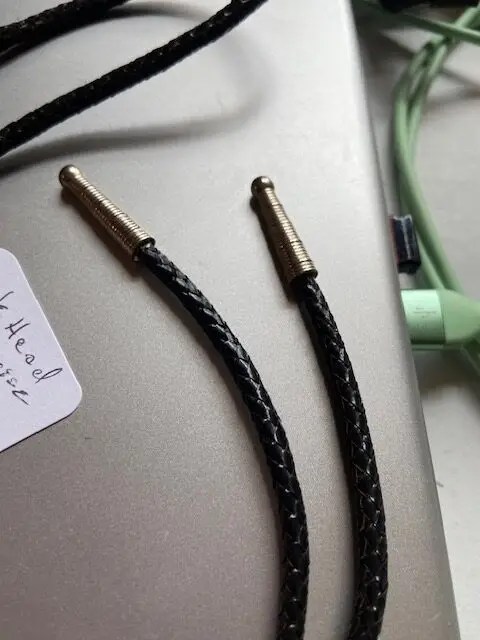 This vintage ‘M’ or “W” monogrammed leather bolo tie is in great condition.  I initially thought it was an M but it is on the straps as a W so I guess it could go either way. Leather straps with gold colored metal ends. Measures about 19 long. Marked PAT180-474 on the back