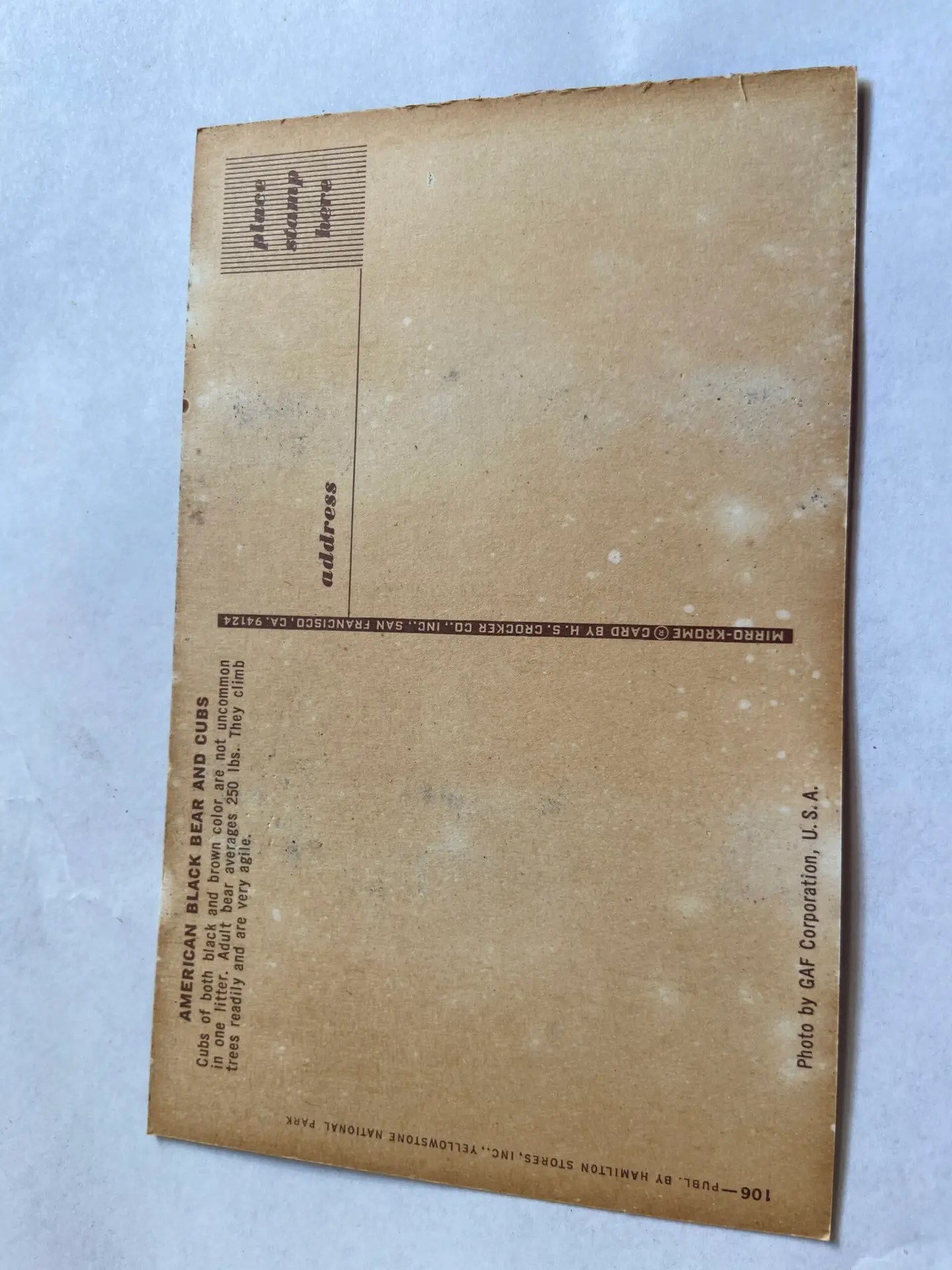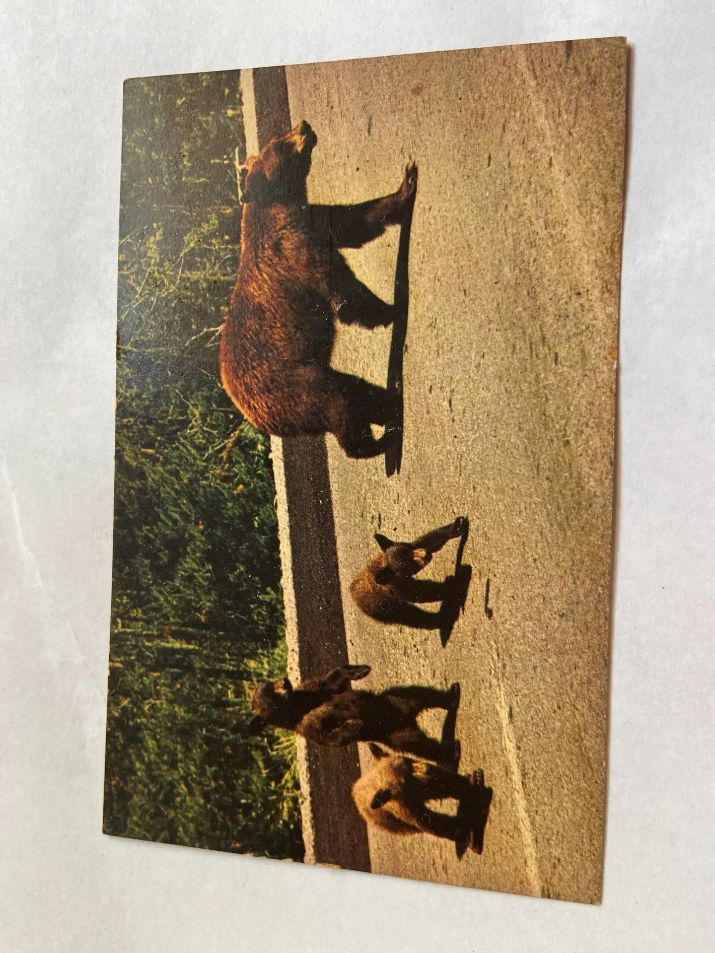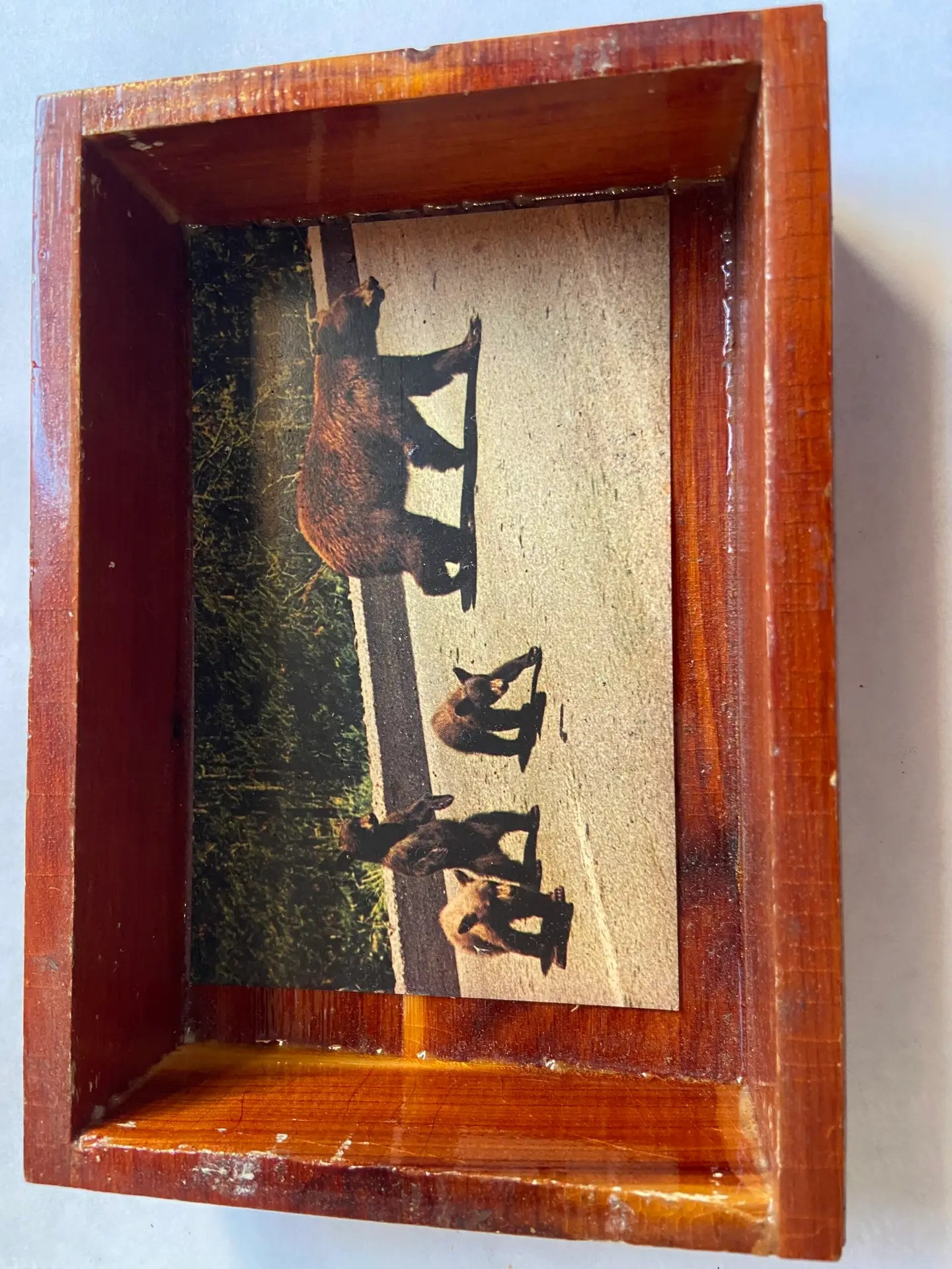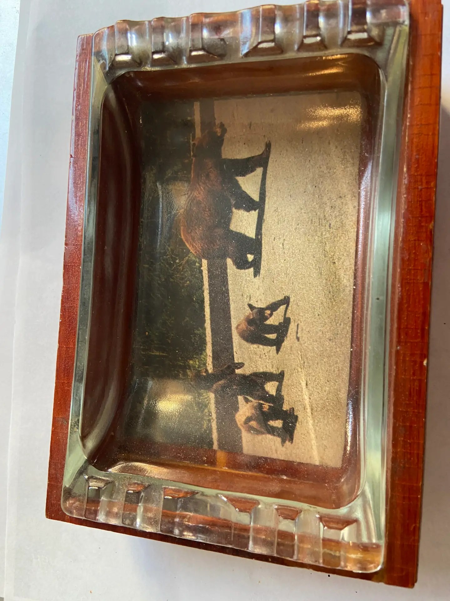 This is a MidCentury Cedar Wood Ashtray from Yellowstone with postcard.  The postcard feature a mama bear and 3 cubs.  This 6 1/2″ x  4 1/2″.  The glass comes out so you could change the picture if you wanted.