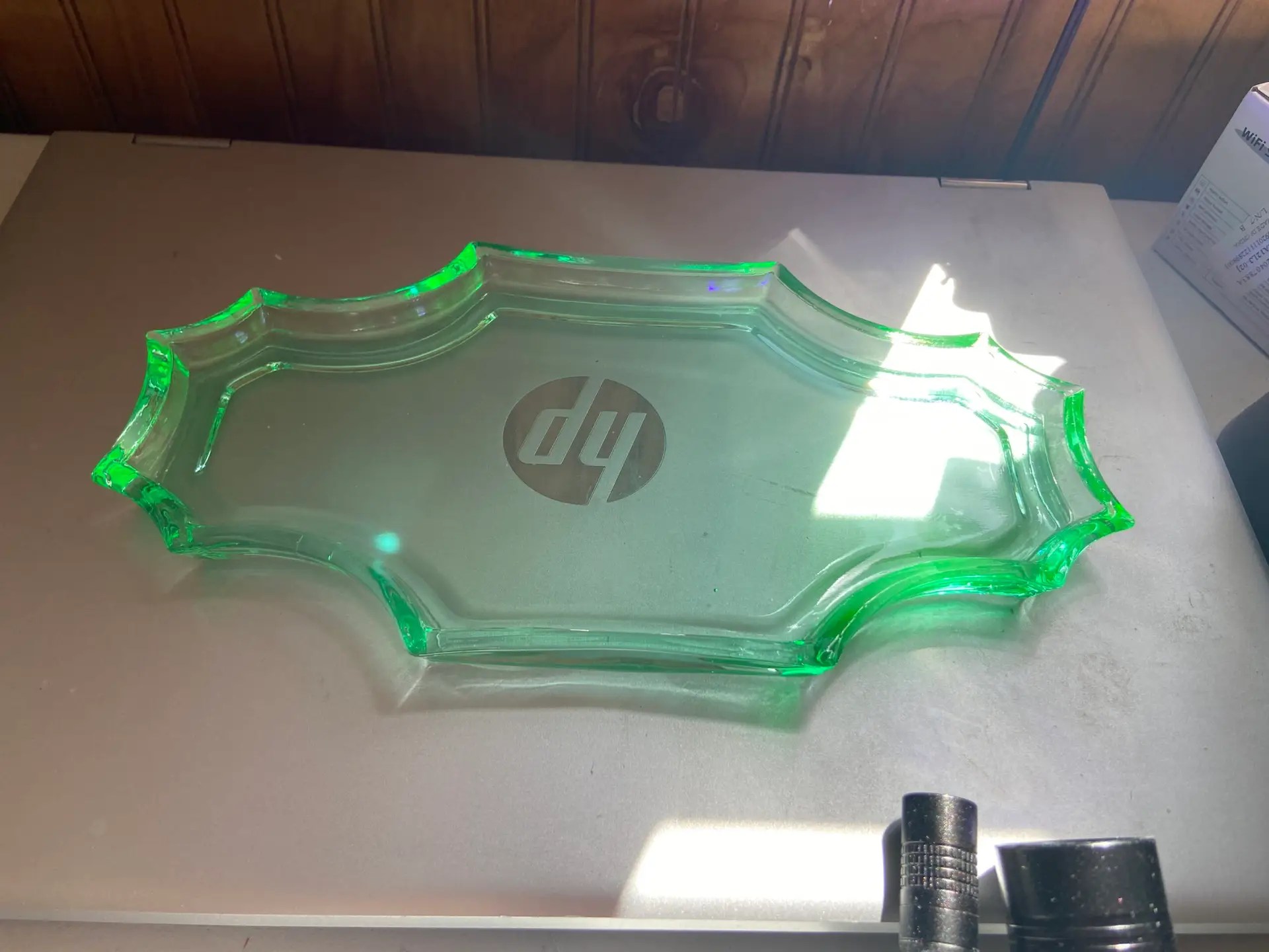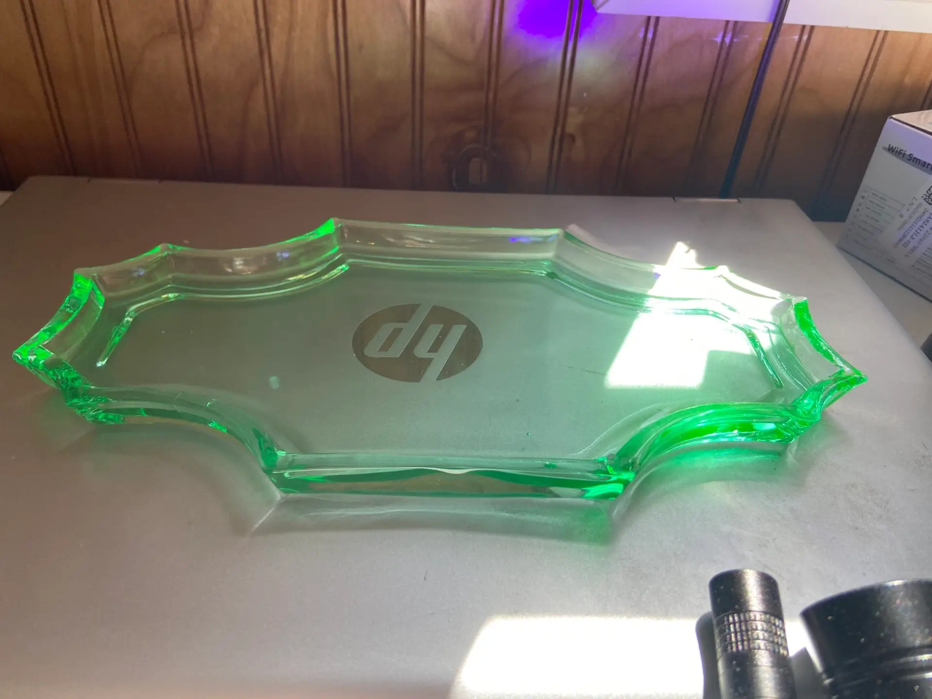 This listing is for a Paden Uranium Glass 10-inch vanity tray, a stunning example of Depression-era glassware. Crafted with precision, this tray features the iconic green uranium glass that glows under black light, adding a unique charm to its design. Measuring 10 inches in diameter, it is both functional and decorative, perfect for showcasing perfumes, jewelry, or other vanity items. A timeless collectible that embodies the elegance of its era.