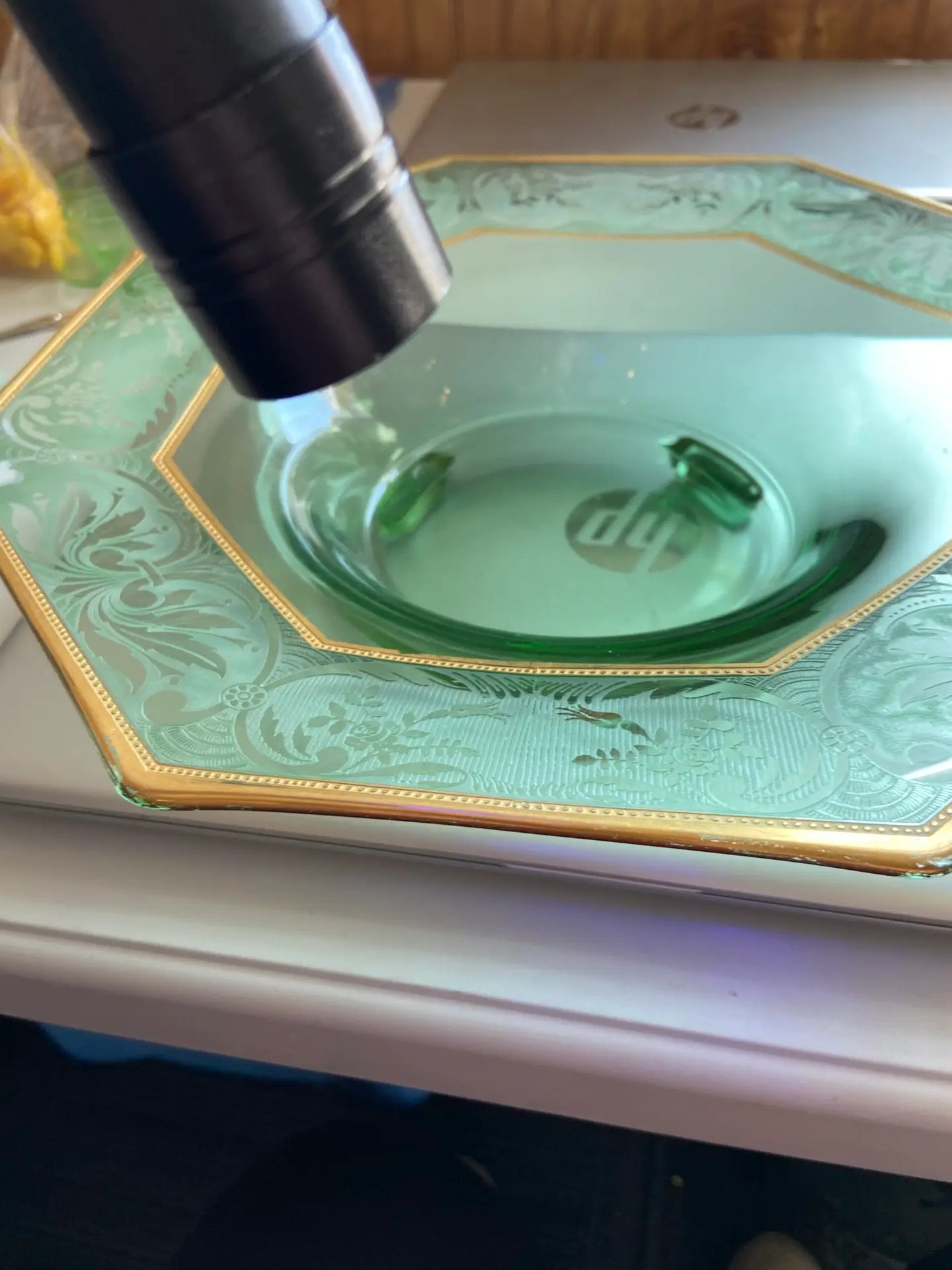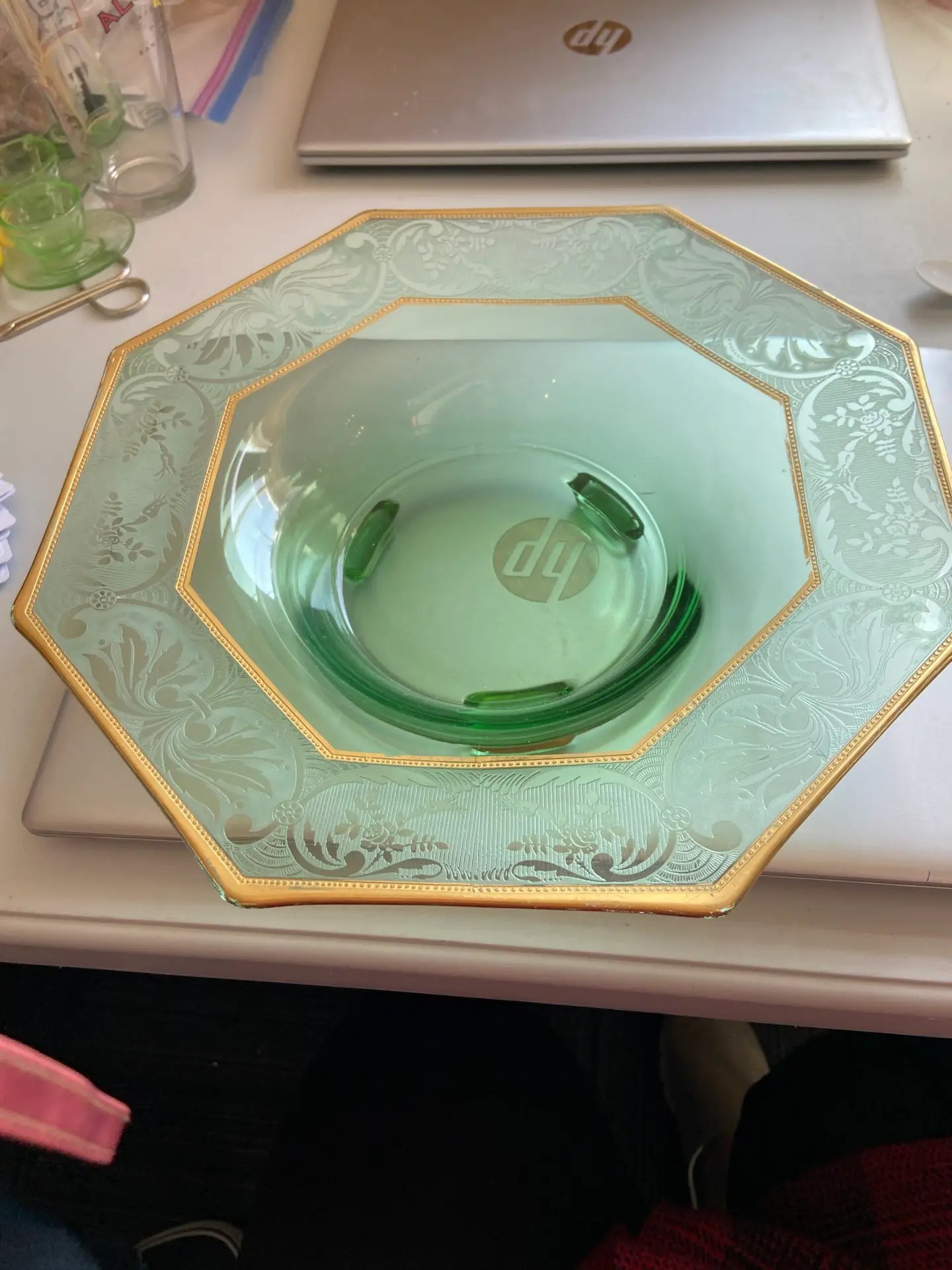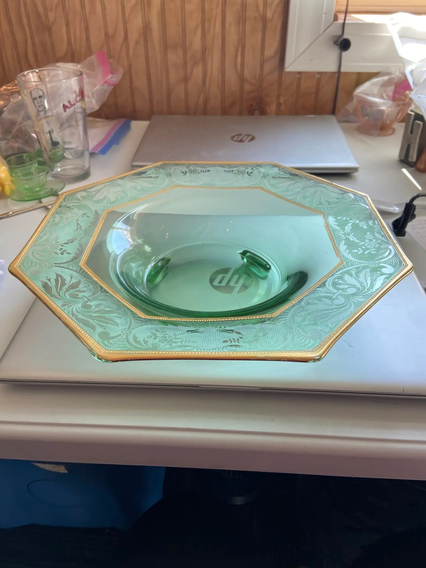 Uranium Octagon Serving Dish with etching and gold trim – 12″ x 3″