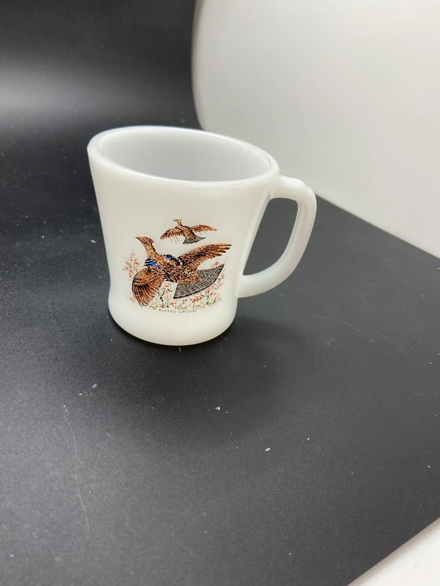 This vintage milk glass mug is a must-have for any collector. The beautiful white mug features a stunning image of a Ruffed Grouse game bird and is made by the well-known brand Fire King. Perfect for all occasions, this mug is both an original and vintage piece from Anchor Hocking’s Fire-King product line. Crafted using fused glass production technique, this mug has a production style of milk glass. It is not handmade and comes from the United States. This mug is an original and licensed reproduction, with a beautiful bird theme that is perfect for any nature lover.