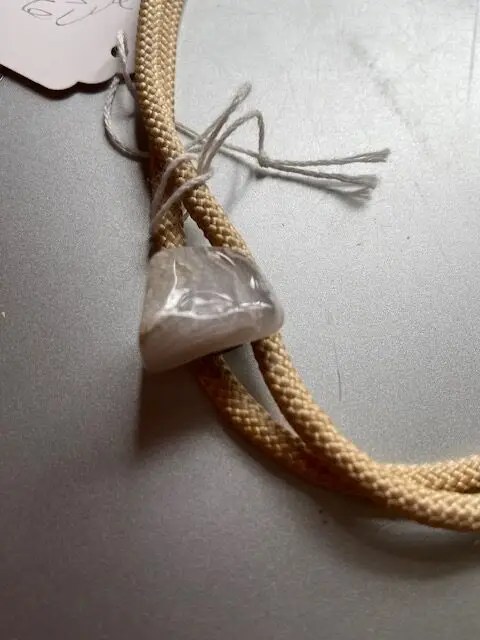 I believe this to be a White Polished Natural Stone Agate Bolo Tie but I cannot guarantee it is agate. The agate stones, known for their captivating patterns, serve as the centerpiece, exemplifying the intricate beauty synonymous with the Western aesthetic. Designed for the discerning individual, this Bolo Tie is a seamless blend of fashion and function. The natural stones ensure that each piece is unique, while the high-quality material promises durability.